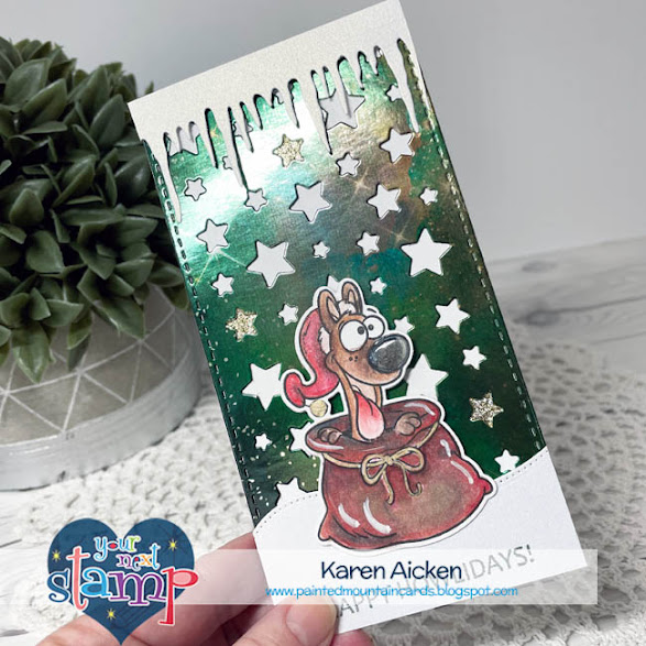 I'm sharing the Mini Slimline card I sent to some dog-loving friends for Christmas. I wish you could see the sparkle and shine on this one - photos just don't do it justice. The Mini Slim Star Panel Die from a galaxy metallic card stock, and after it was adhered to the card base I added more sparkle by adding gold Stickls into some of the star openings. The Icicles were cut from white pearl card stock as well.