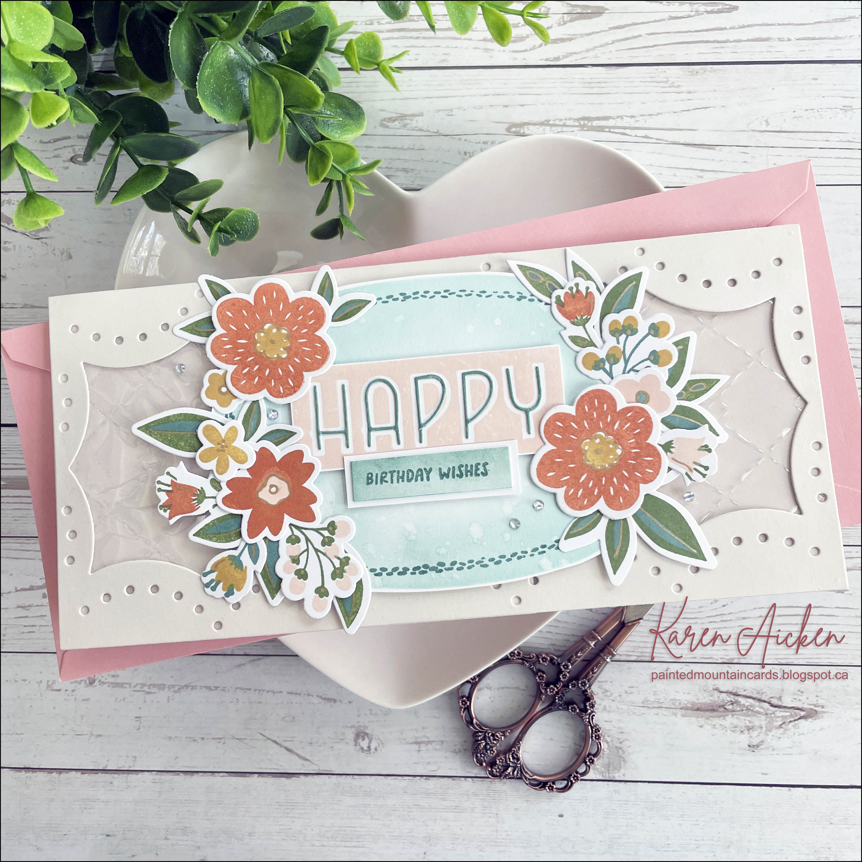 The Scallops & Trims die is sized for an A2 card and cuts at 4 x 5.25". Because I wanted to make a Slimline card using that die set, this Slimline is 4 x 8.5" instead of the 3.5 x 8.5" that the first card measured. I cut transparencies just a little smaller than the Scallop frames and ran them through with the Dashed Diamonds Cover Plate. This gave such a nice embossed texture to the transparencies!
