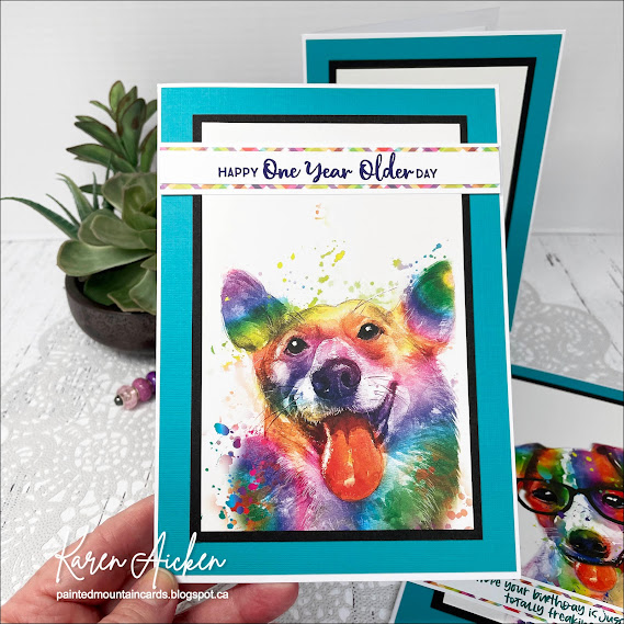 Last week I shared a pop up card using one of these rainbow dog note cards and I liked the teal & black matting so much I used them again for these three 5x7" cards. I am having so much fun with these note cards by cutting them down and adding stamping etc.