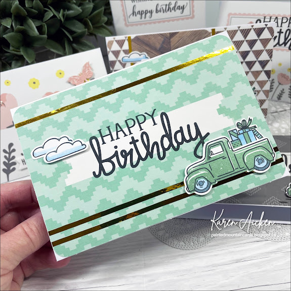 I made three floral cards and three more masculine ones with Stampin' Up's Truckin' Along stamp & punch. The cards are all 6x4" and some have narrow gold foil tape for a little shine. Other's have Stickles glitter glue on them.
